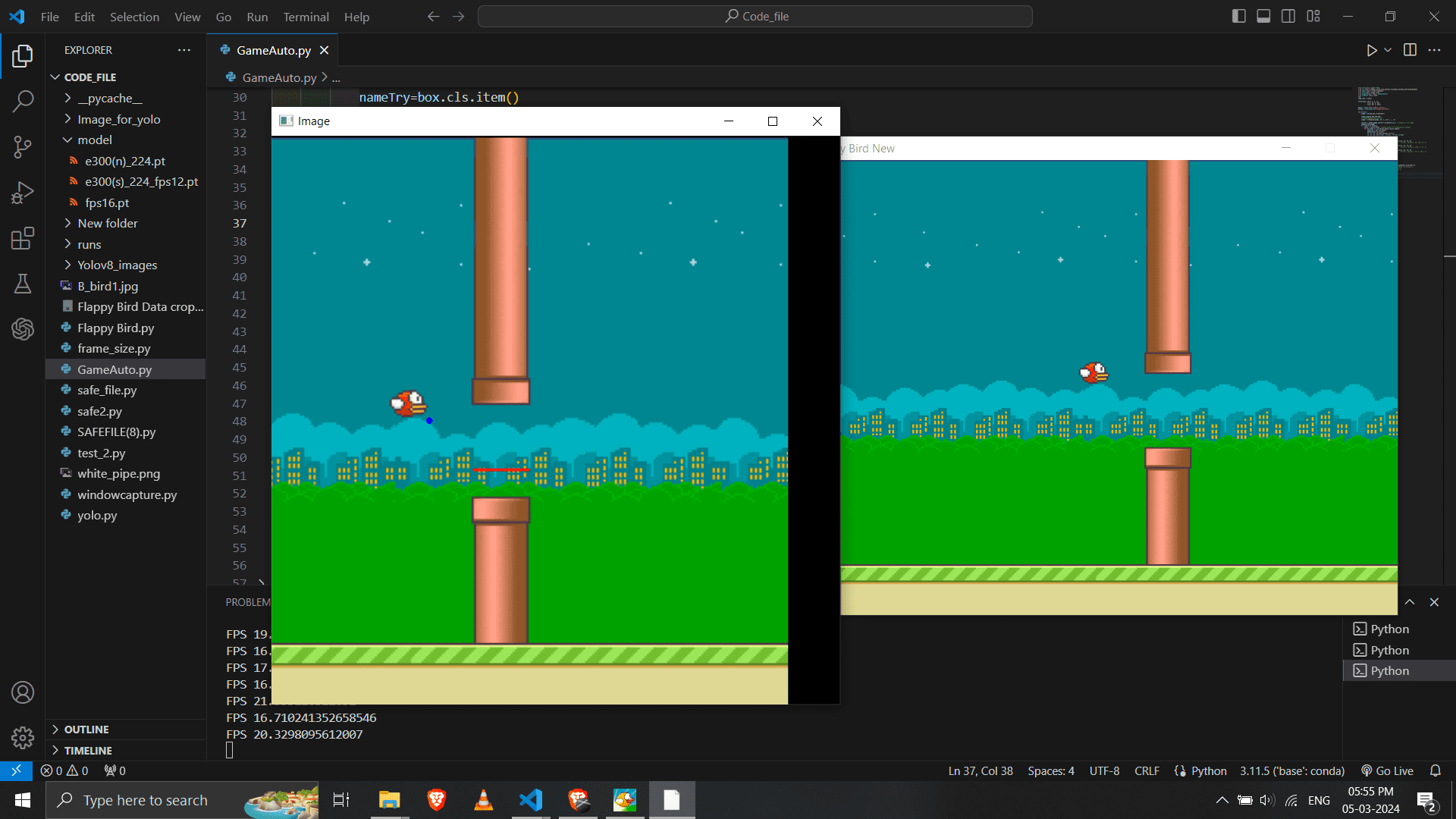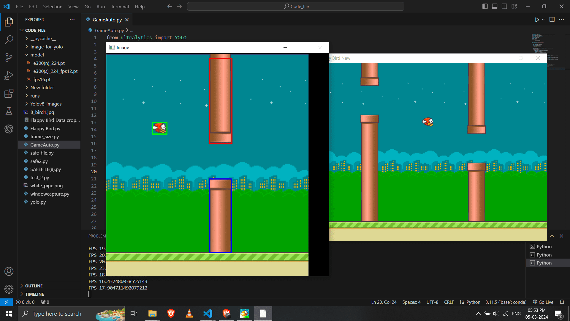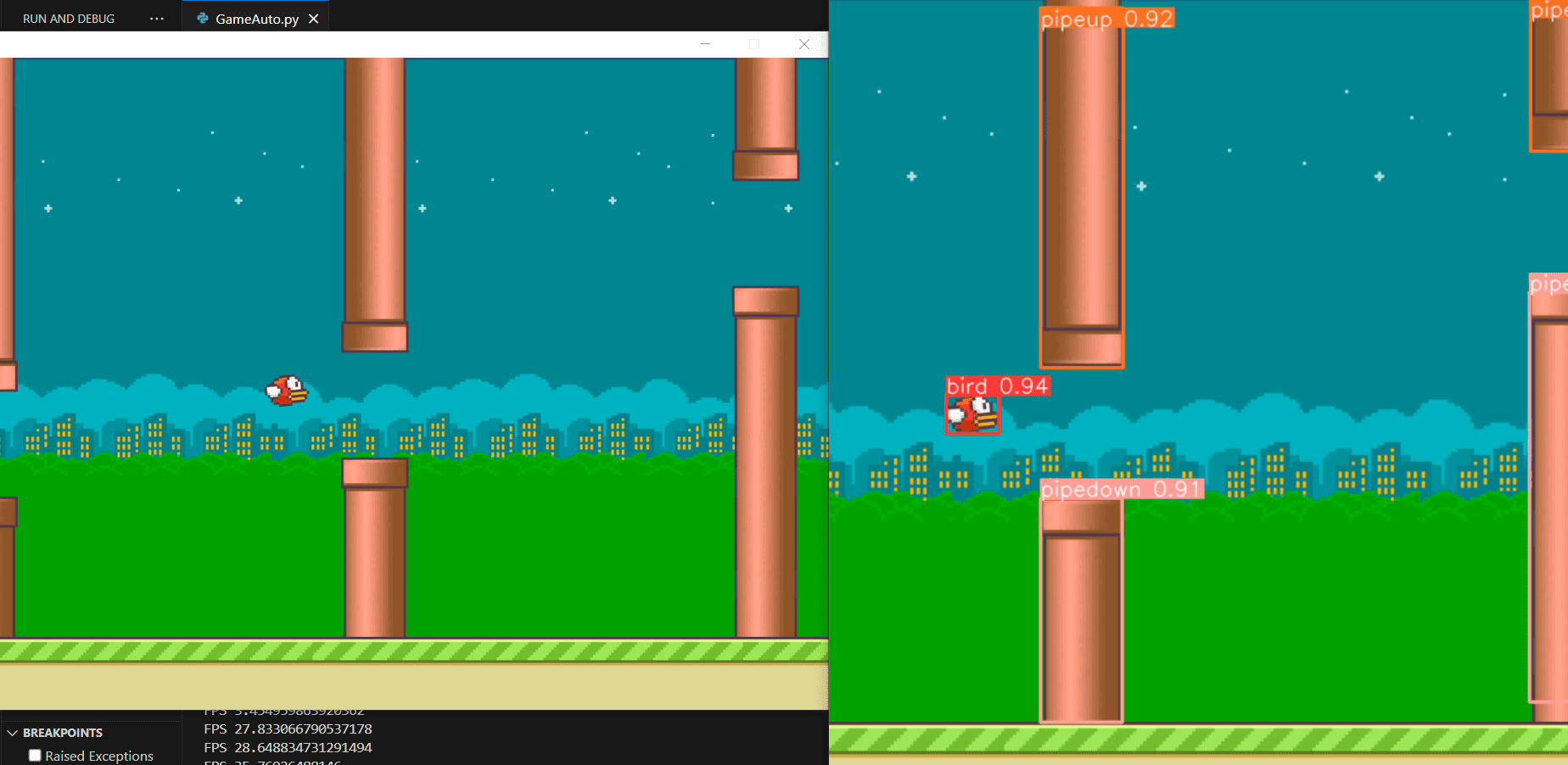 - Object Detection: YOLOv8 is trained/used to detect the specific game assets (The Bird, Upper Pipe, Lower Pipe).