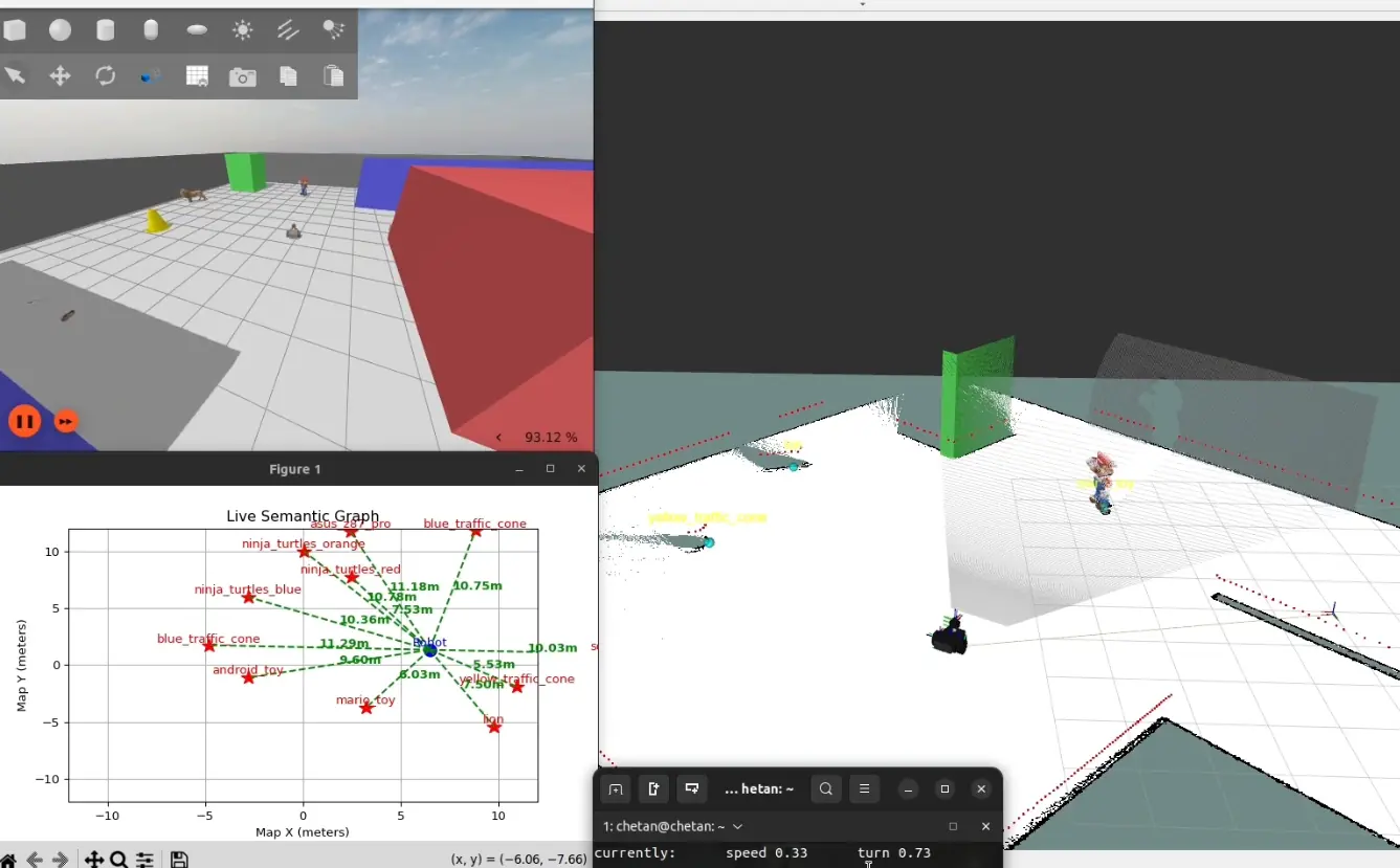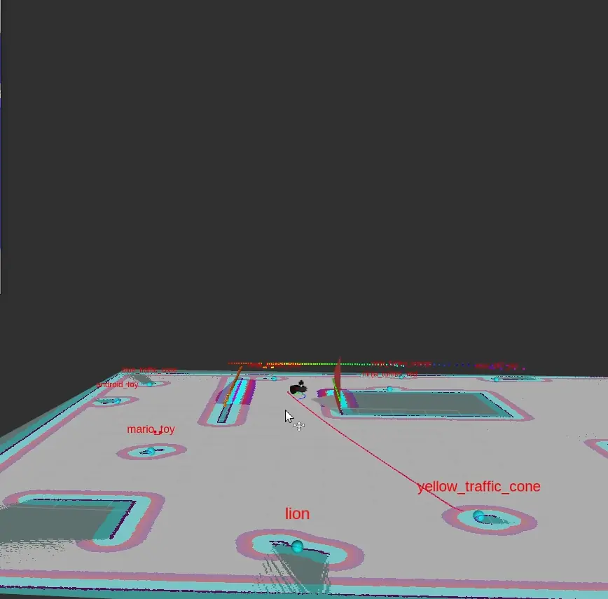 Crucially, when the user follows up with "Which object is close to it?", the robot maintains the conversation context—understanding that "it" refers to the lion identified previously. It then queries its JSON spatial database to calculate the nearest neighbor (the yellow traffic cone) and autonomously plans a path to that coordinate via Nav2, even without the user repeating the object's name.
