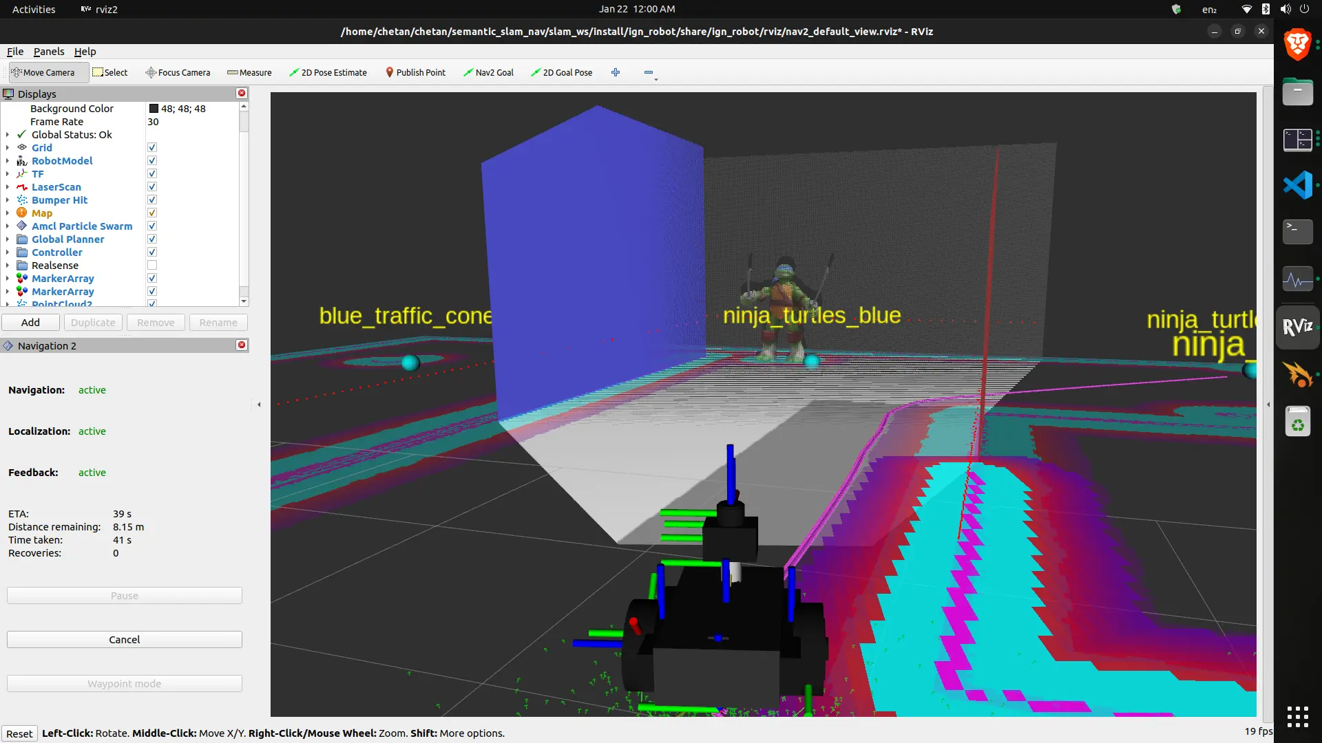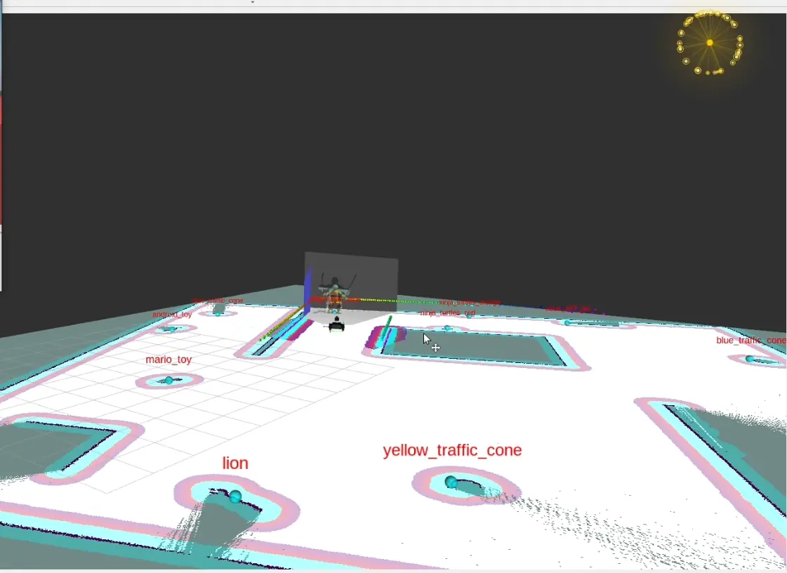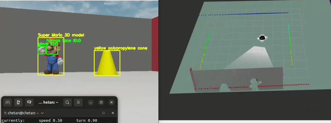 This phase focused on achieving low-latency perception. By integrating fine-tuned YOLOv8 with the SLAM Toolbox, I developed a pipeline that projects 2D object detections into a 3D spatial occupancy grid. This allows the robot to "see" and remember the physical location of objects in real-time without compromising navigation speed.
